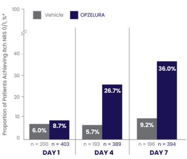 The bar chart above shows the proportion of clinical trial participants who had Itch NRS 0/1 in the first 7 days of treatment. 36% of patients taking OPZELURA showed Itch NRS 0/1 at Day 7 vs. 9.2% for vehicle.6