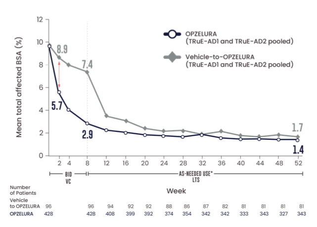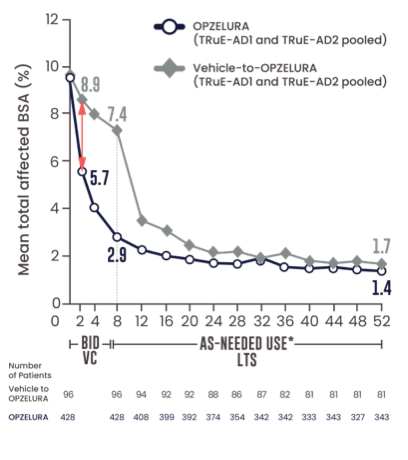 The visualization above shows the reduction in mean total affected BSA from the pooled LTS data from TRuE-AD1 and TRuE-AD2 clinical trials from baseline to Week 52. Patients taking OPZELURA experienced a reduction to 1.4% mean total affected BSA by Week 52 vs. a reduction to 1.7% for those taking the vehicle-to-OPZELURA.8