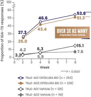 The line graph above shows the proportion of IGA-TS responders for OPZELURA and vehicle from the TRuE-AD1 and TRuE-AD2 clinical trials from Week 0 to Week 8. At Week 8, 53.8% of patients taking OPZELURA achieved clear or almost clear results vs. 15.1% for vehicle in TRuE-AD1. In TRuE-AD2, 51.3% of patients taking OPZELURA achieved clear or almost clear results vs. 7.6% for vehicle. This demonstrates over 3x as many responders to OPZELURA than vehicle.1-3
