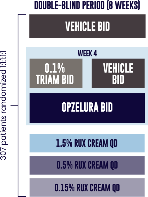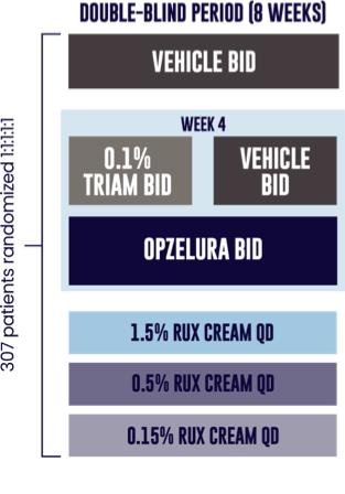 The graphic above shows the study design for the phase 2, randomized, double-blind, dose-ranging, vehicle- and active-controlled study in adult patients with AD. 307 patients were randomized evenly for 8 weeks of double-blind treatment: vehicle, triamcinolone cream (0.1% BID for 4 weeks, then vehicle for 4 weeks), OPZELURA BID, ruxolitinib cream 1.5% QD, ruxolitinib cream 0.5% QD, or ruxolitinib cream 0.15% QD.9