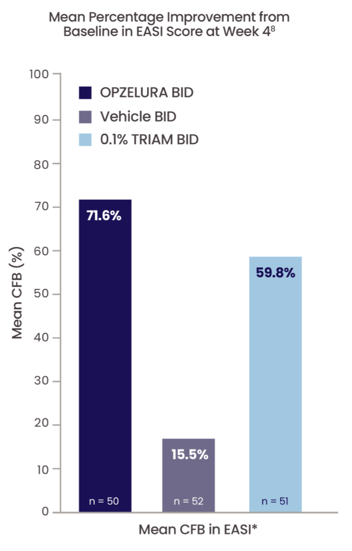 The bar graph shows the comparison of the mean percentage improvement from baseline in EASI score at Week 4, with OPZELURA (n = 50) demonstrating a 71.6% mean CFB, vehicle (n = 52) a 15.5% mean CFB, and triamcinolone (n = 51) a 59.8% mean CFB.9