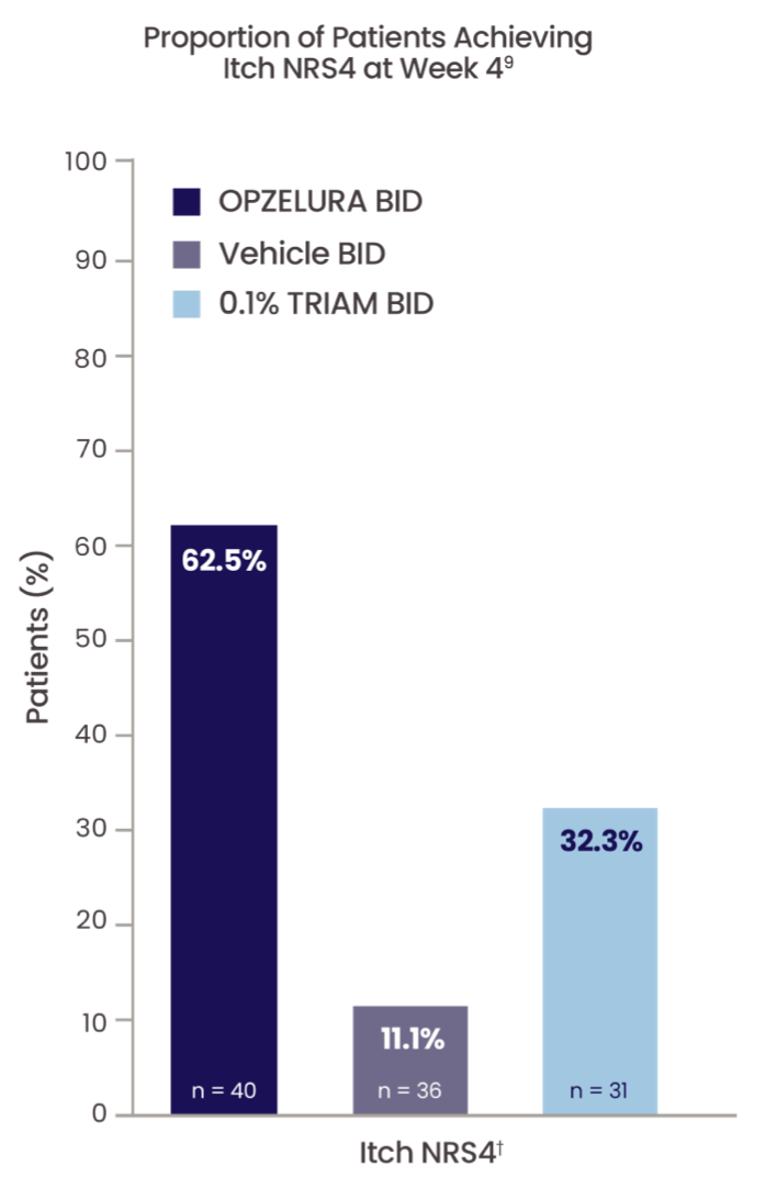 The bar graph shows the comparison of the proportion of patients achieving Itch NRS4 at Week 4, with OPZELURA (n = 40) demonstrating 62.5% responders, vehicle (n = 36) 11.1% responders, and triamcinolone (n = 11) 32.2% responders.10