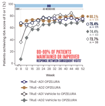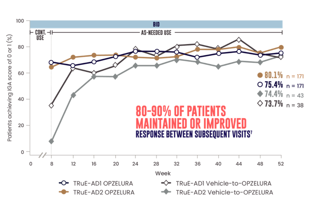 The line graph above shows the proportion of patients achieving IGA scores of 0/1 with OPZELURA at Week 52. In TRuE-AD1 and TRuE-AD2, respectively, 75.4% and 80.1% of patients on OPZELURA vs. 73.7% and 74.4% of patients on vehicle achieved clear or almost clear skin after switching from vehicle to OPZELURA and using as needed in the 44-week extension period. 80% to 90% of patients maintained or improved response between subsequent visits.6