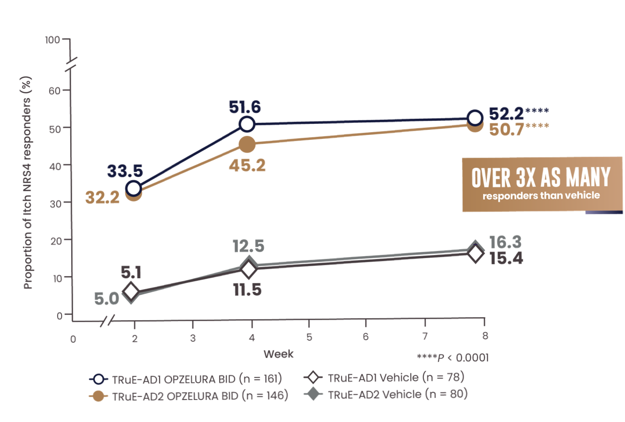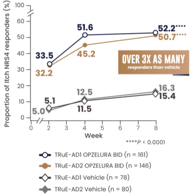 The line graph above shows the proportion of Itch NRS4 responders for OPZELURA and vehicle from the TRuE-AD1 and TRuE-AD2 clinical trials from Week 0 to Week 8. At Week 8, 52.2% of patients taking OPZELURA achieved a 4-point improvement in itch vs. 15.4% for vehicle in TRuE-AD1. In TRuE-AD2, 50.7% of patients taking OPZELURA achieved a 4-point improvement in itch vs. 16.3% for vehicle. This demonstrates over 3x as many responders to OPZELURA than vehicle.1-3