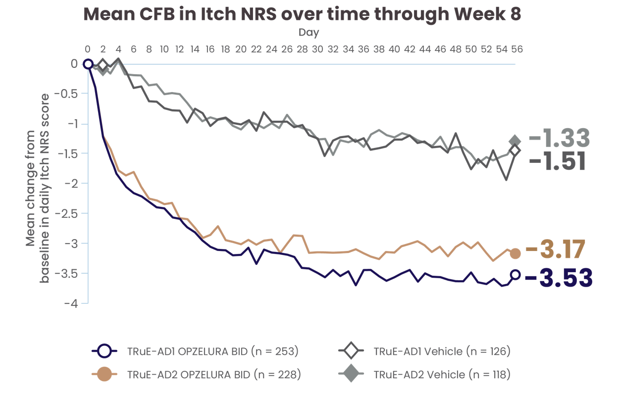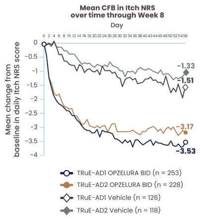 The line graph above shows the mean change from baseline in Itch NRS scores from the clinical trials from Day 0 to Day 56. In TRuE-AD1 and TRuE-AD2, the mean score at Day 56 was 3.53 and 3.17 points lower, respectively, for patients taking OPZELURA as compared with 1.51 and 1.33 points lower, respectively, for those taking the vehicle.2