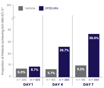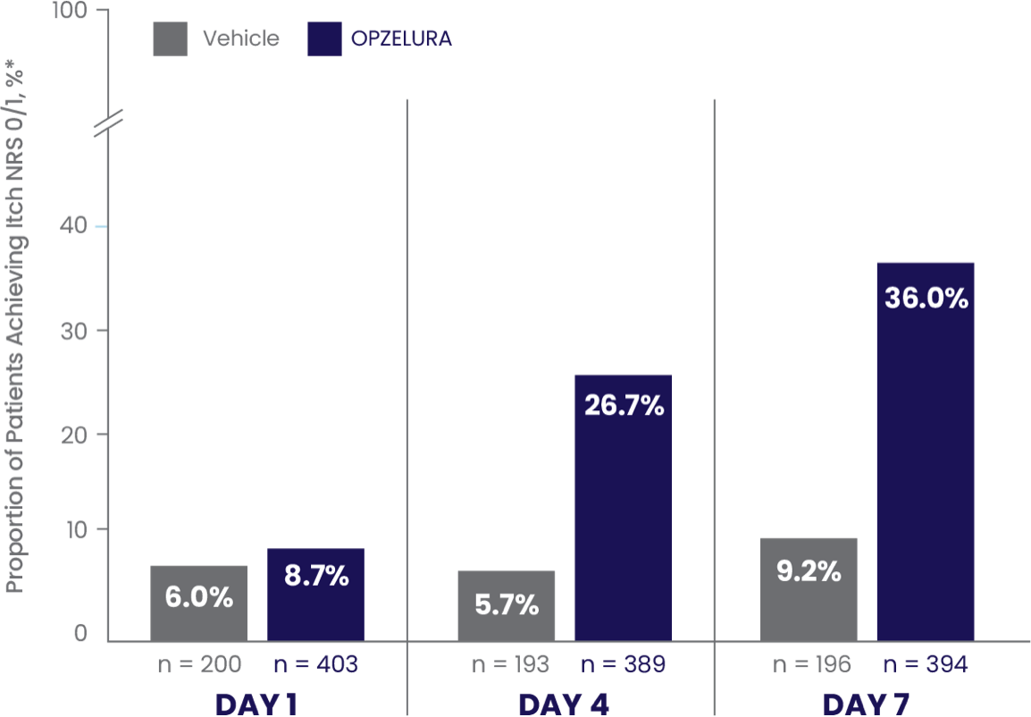 The bar chart above shows the proportion of clinical trial participants who had Itch NRS 0/1 in the first 7 days of treatment. 36% of patients taking OPZELURA showed Itch NRS 0/1 at Day 7 vs. 9.2% for vehicle.6