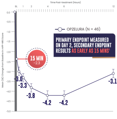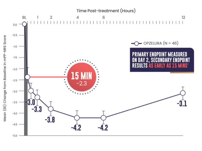 The line graph above shows that OPZELURA (n = 46) demonstrated a mean change from baseline in mPP-NRS score of -2.3 at 15 minutes. At 30 minutes, the mean change was -3.0. At 1 hour, the mean change was -3.3. At 2 hours, the mean change was -3.8. At 4 and 6 hours, the mean change was -4.2. At 12 hours post treatment, the mean change was -3.1.5,7