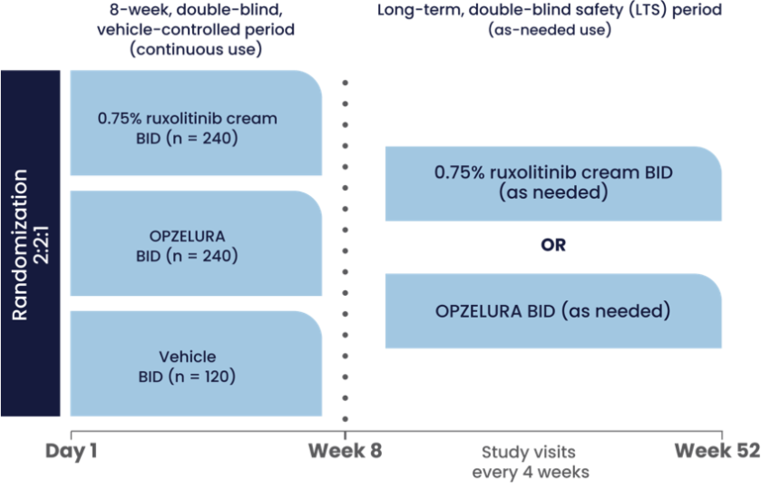 In both studies, patients were randomized to monotherapy with OPZELURA, ruxolitinib cream 0.75%, or vehicle BID for 8 weeks and as needed during a 44-week extension.1,2